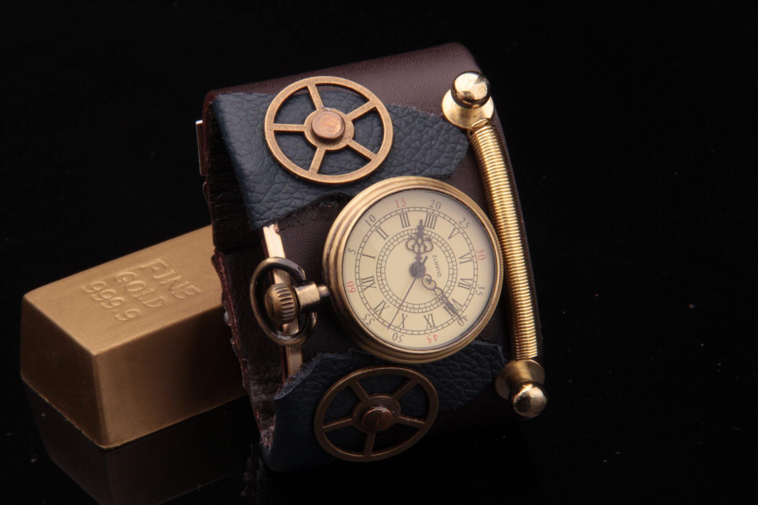 Genuine Leather and pu leather steampunk watch cuff with gears, watch, spring, rivets and a really unique alloy clasp with a hinge. Perfect for the everyday retro style or the steampunk enthusiast.